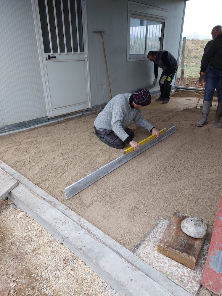 C’est du sérieux ! Michel met à niveau le sol L’équipe à pied d’oeuvre ! Les travaux continuent en cette matinée d’hiver. Le dallage de l’espace entre les deux bungalows est en cours de réalisation. Une bonne partie de l’équipe œuvre pour avancer malgré le froid en ce début d’année. Tout doit être prêt pour accueillir les nouveaux élèves ! toutes les compétences des uns et des autres sont au service de cette belle réalisation ! M-J IRLES Alain dame le terrain avec soin ! Que de brouettes pour un beau résultat ! Dernier réglage avant la pose des dalles